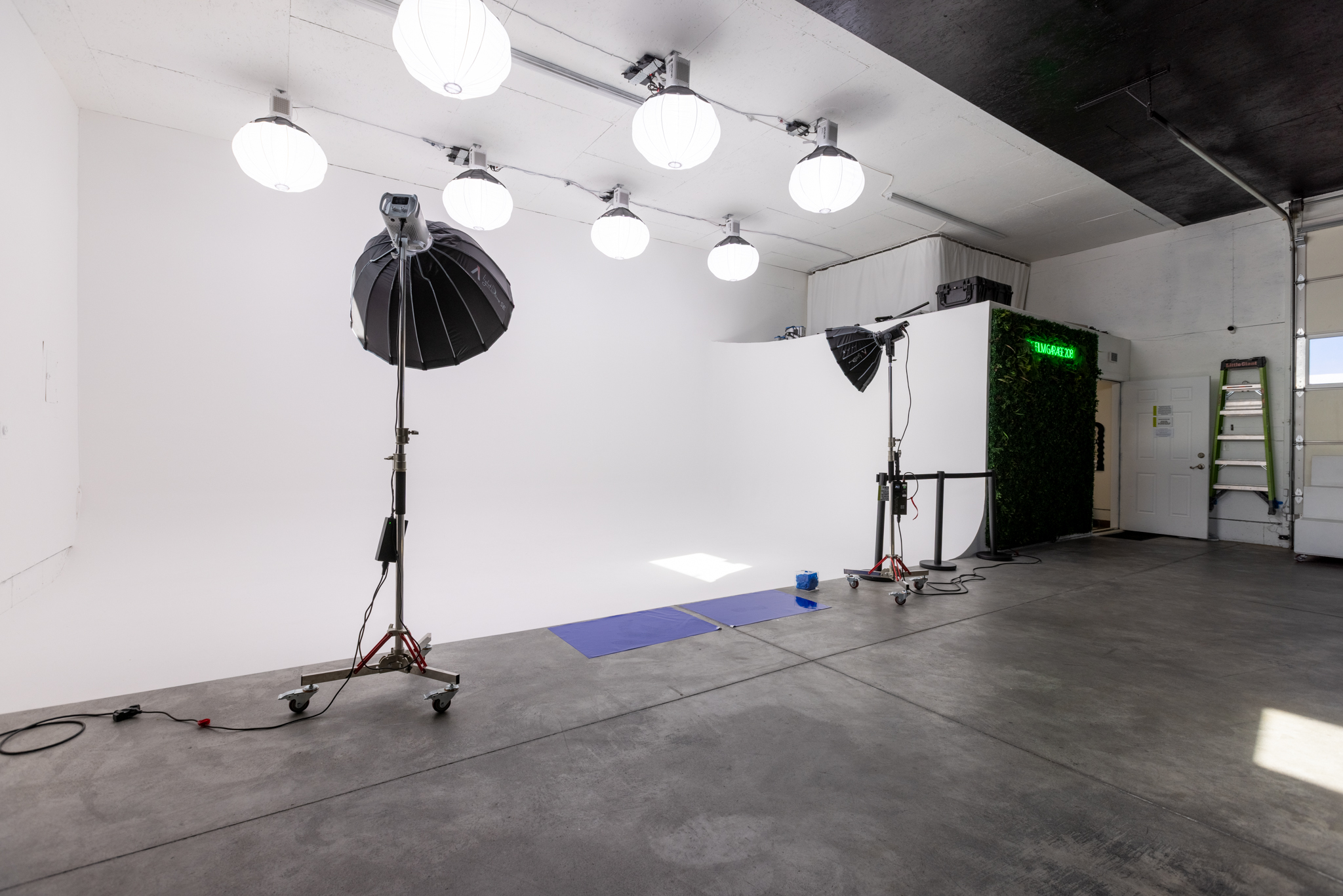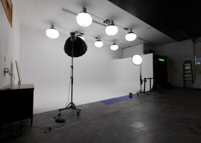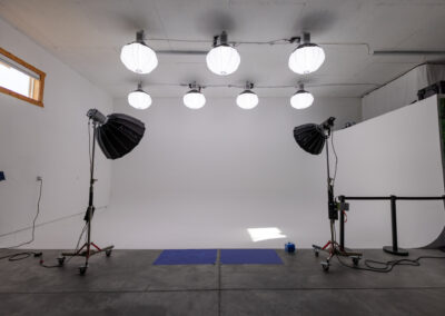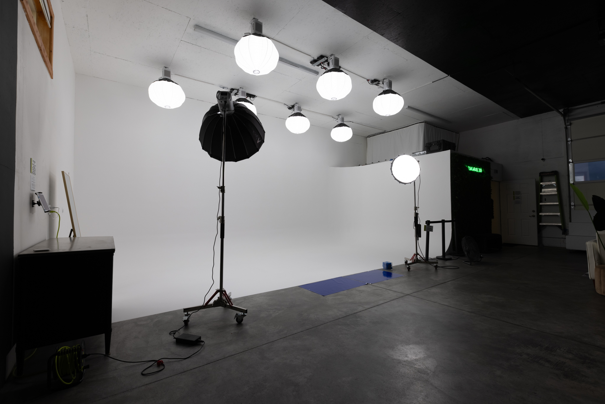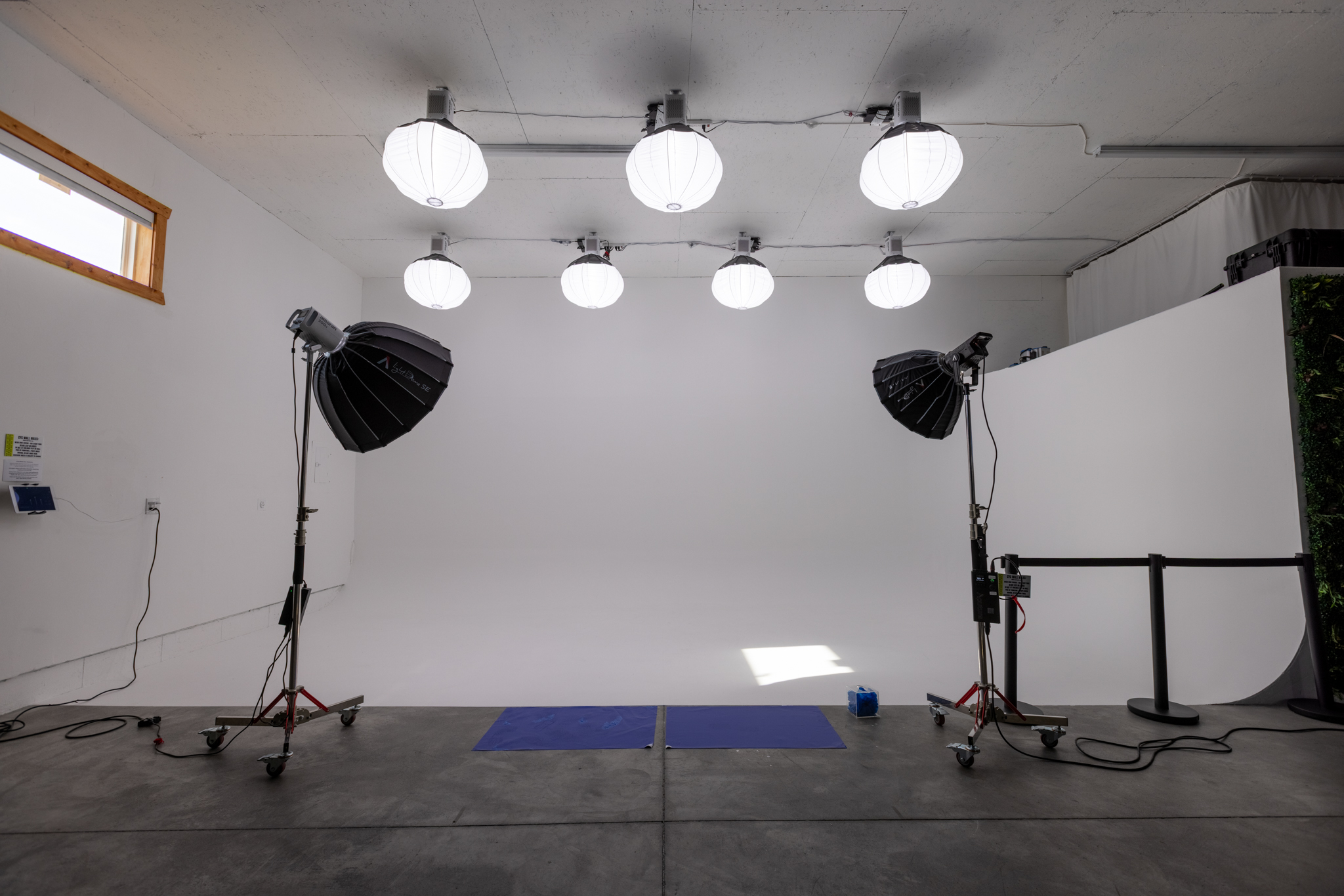 12 ft by 25 ft corner cyclorama wall with seven Amaran 300c ceiling lights controlled by an iPad. Lights can easily change to any color.