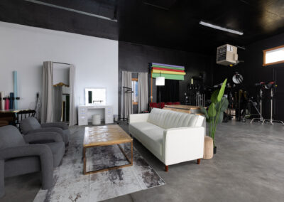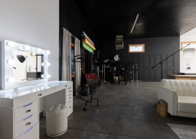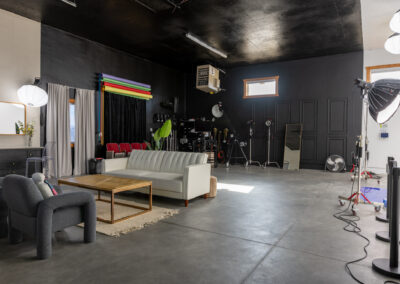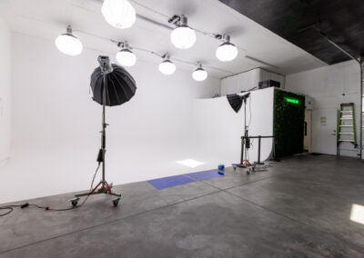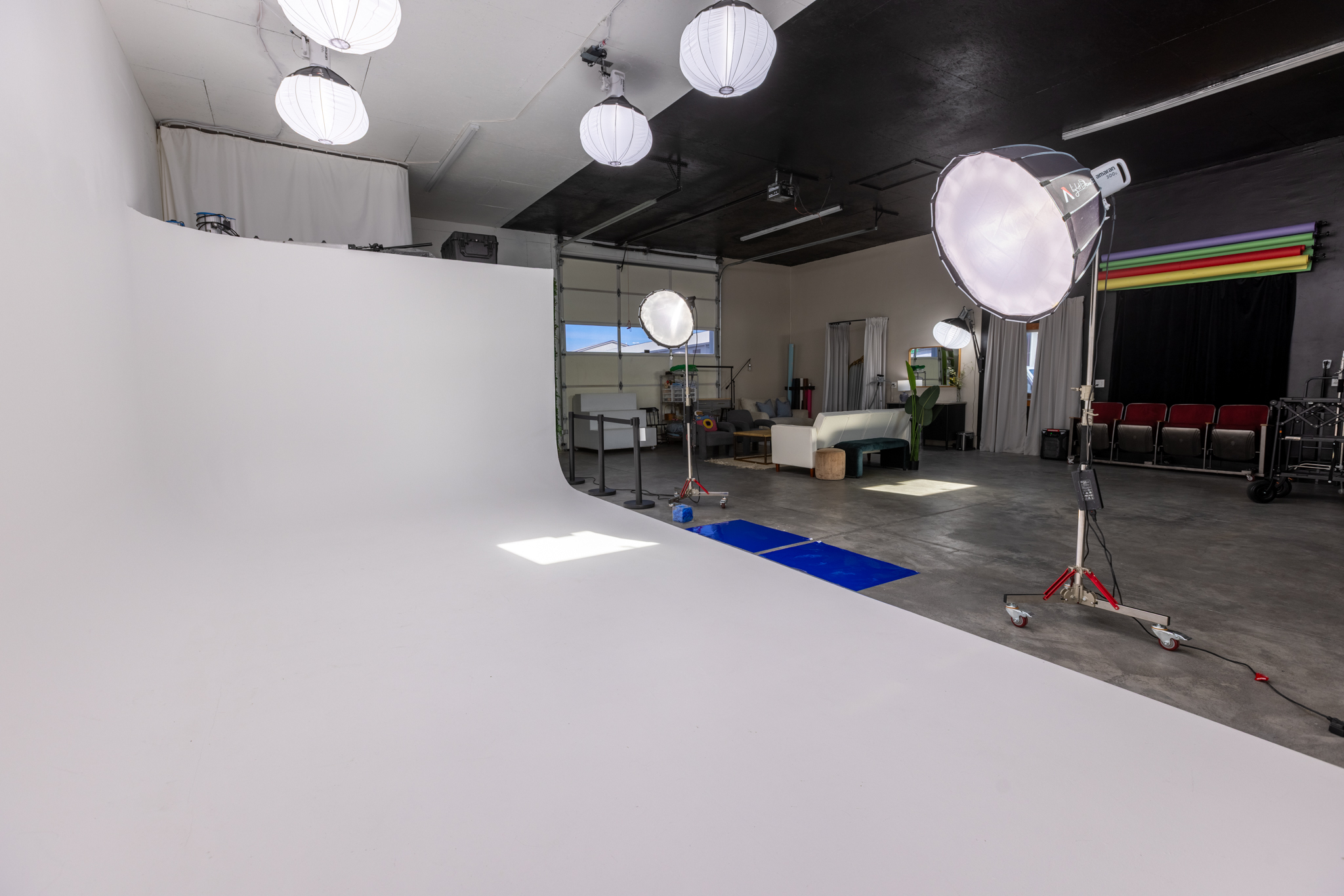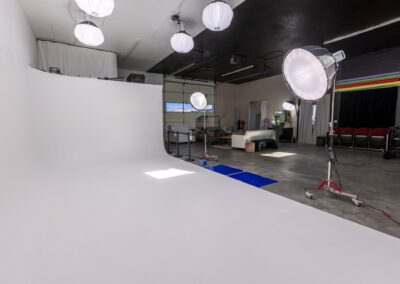 At the center of the space is our expansive cyclorama wall, allowing for clean, seamless backgrounds ideal for commercial work, branding sessions, product shoots, and high-end visual content.