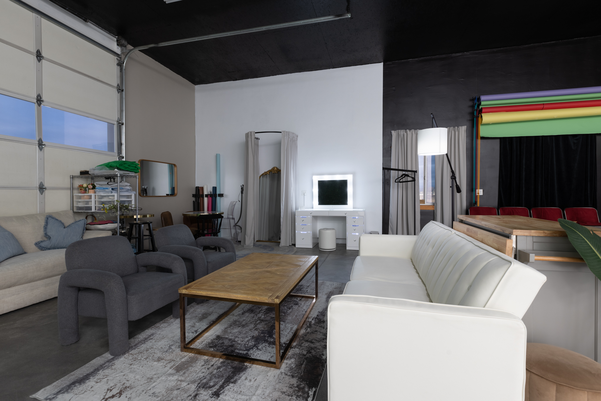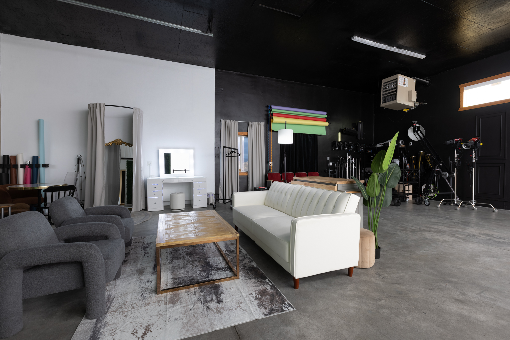 Give your clients a space to relax. In the photo studio we have a spacious area with a comfortable couch and coffee table or use as props in your shoot.